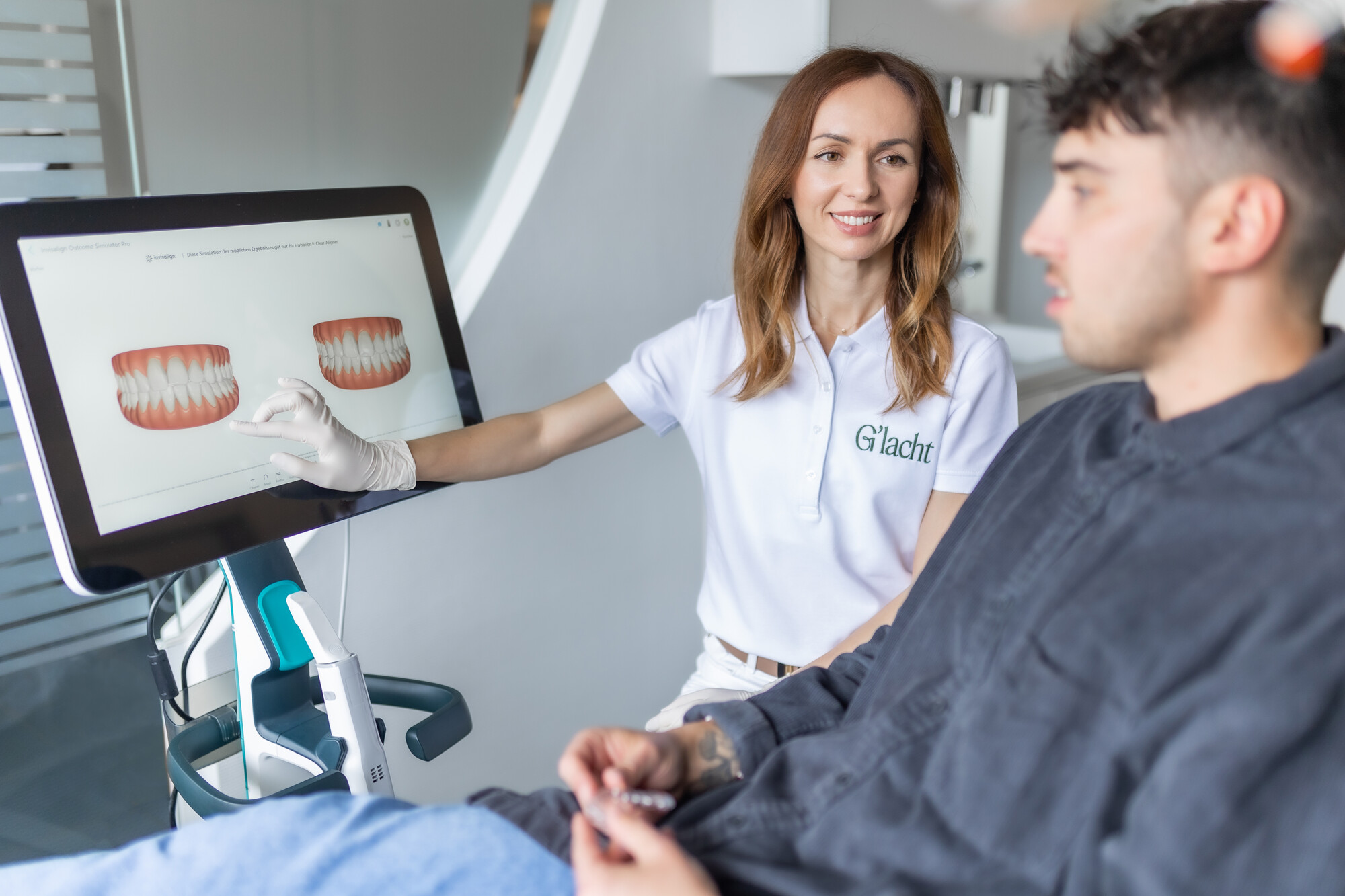 Beratung und Kontrolle bequem von zu Hause aus: Die Videosprechstunde bei G’lacht bieten wir als Ergänzung zu den regulären Terminen in der Praxis. Im Zusammenspiel mit der Dental Monitoring App können wir den Behandlungsfortschritt überwachen. Sie sparen so manchen Weg — und gewinnen dadurch mehr Zeit!